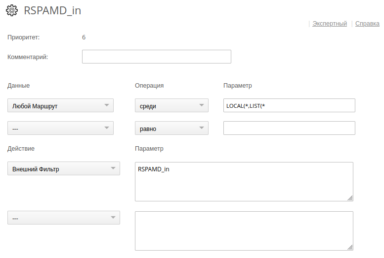 Установки -> Почта -> Правила -> RSPAMD_in